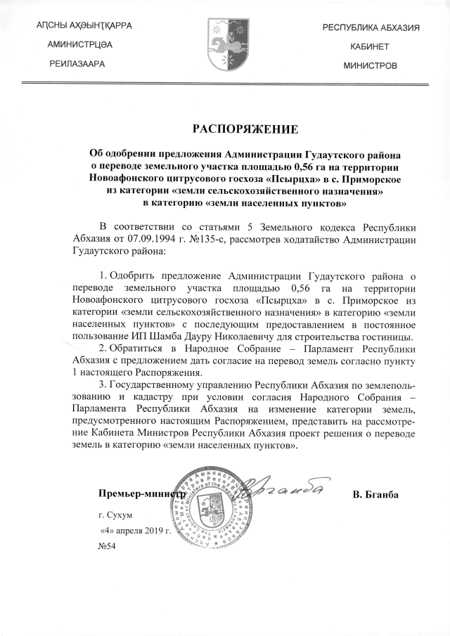 РАСПОРЯЖЕНИЕ Кабинета Министров Республики Абхазия от 04.04.2019 №54 "Об одобрении предложения Администрации Гудаутского района о переводе земельного участка площадью 0,56 га на территории Новоафонского цитрусового госхоза "Псырцха" в с. Приморское из категории "земли сельскохозяйственного назначения" в категорию "земли населенных пунктов""
