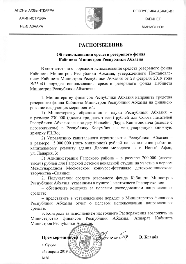 РАСПОРЯЖЕНИЕ Кабинета Министров Республики Абхазия от 04.04.2019 №56 "Об использовании средств резервного фонда Кабинета Министров Республики Абхазия"