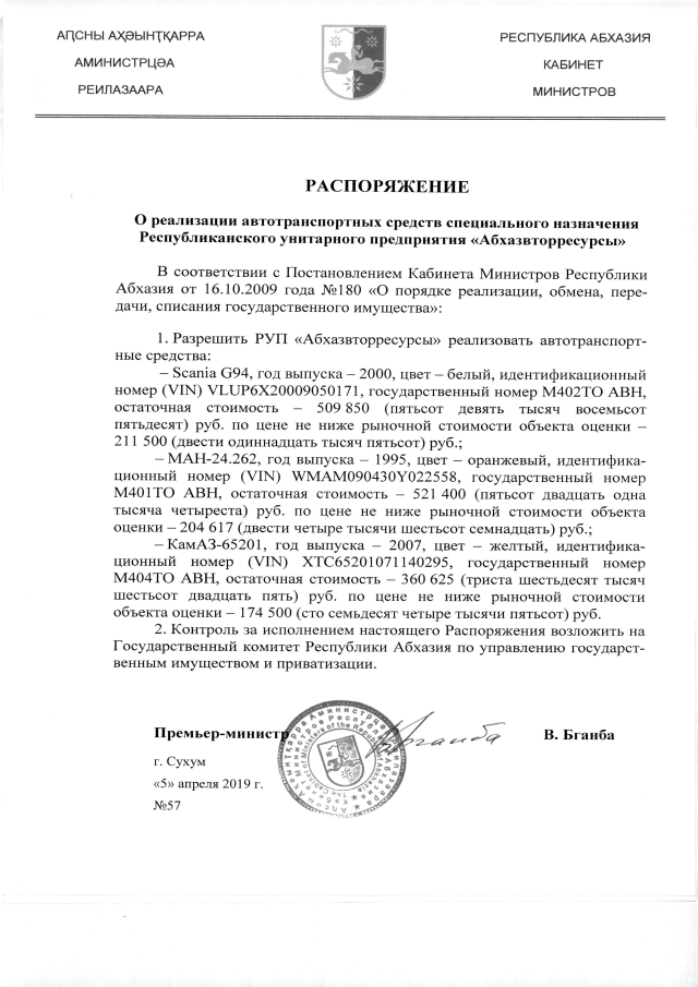 РАСПОРЯЖЕНИЕ Кабинета Министров Республики Абхазия от 05.04.2019 №57 "О реализации автотранспортных средств специального назначения Республиканского унитарного предприятия "Абхазвторресурсы""