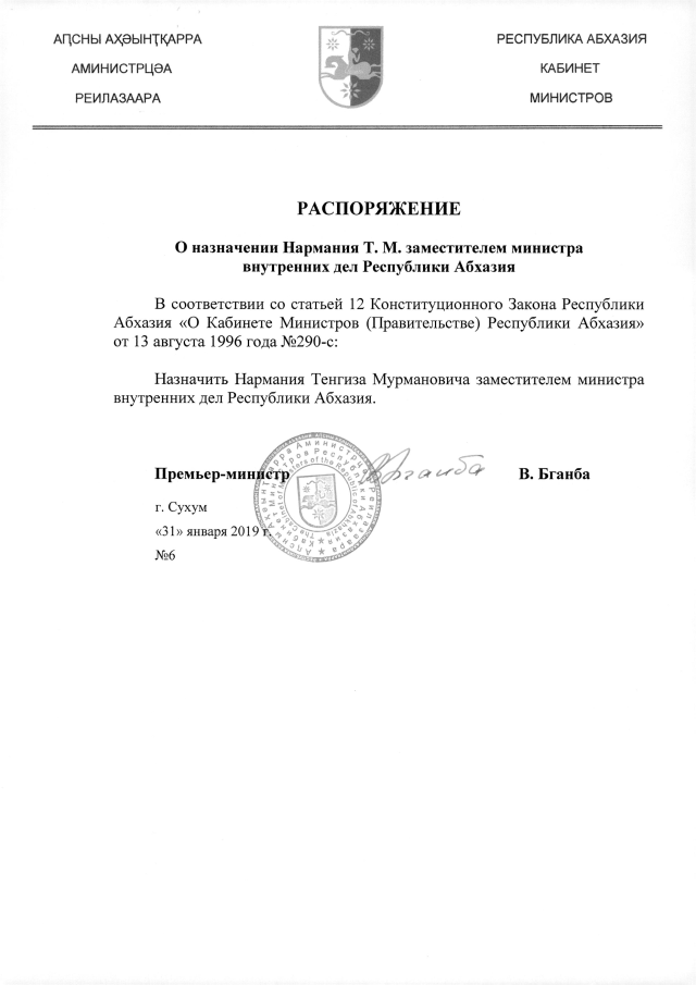 РАСПОРЯЖЕНИЕ Кабинета Министров Республики Абхазия от 31.01.2019 №6 "О назначении Нармания Т.М. заместителем министра внутренних дел Республики Абхазия"