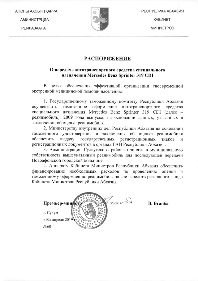 РАСПОРЯЖЕНИЕ Кабинета Министров Республики Абхазия от 10.04.2019 №60 "О передаче автотранспортного средства специального назначения Mercedes Benz Sprinter 319 CDI"