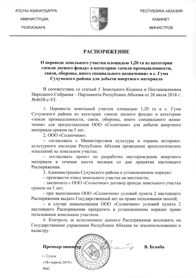 РАСПОРЯЖЕНИЕ Кабинета Министров Республики Абхазия от 18.04.2019 №62 "О переводе земельного участка площадью 1,20 га из категории "земли лесного фонда" в категорию "земли промышленности, связи, обороны, иного специального назначения" в с. Гума Сухумского района для добычи инертного материала"