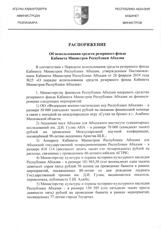 РАСПОРЯЖЕНИЕ Кабинета Министров Республики Абхазия от 22.04.2019 №65 "Об использовании средств резервного фонда Кабинета Министров Республики Абхазия"