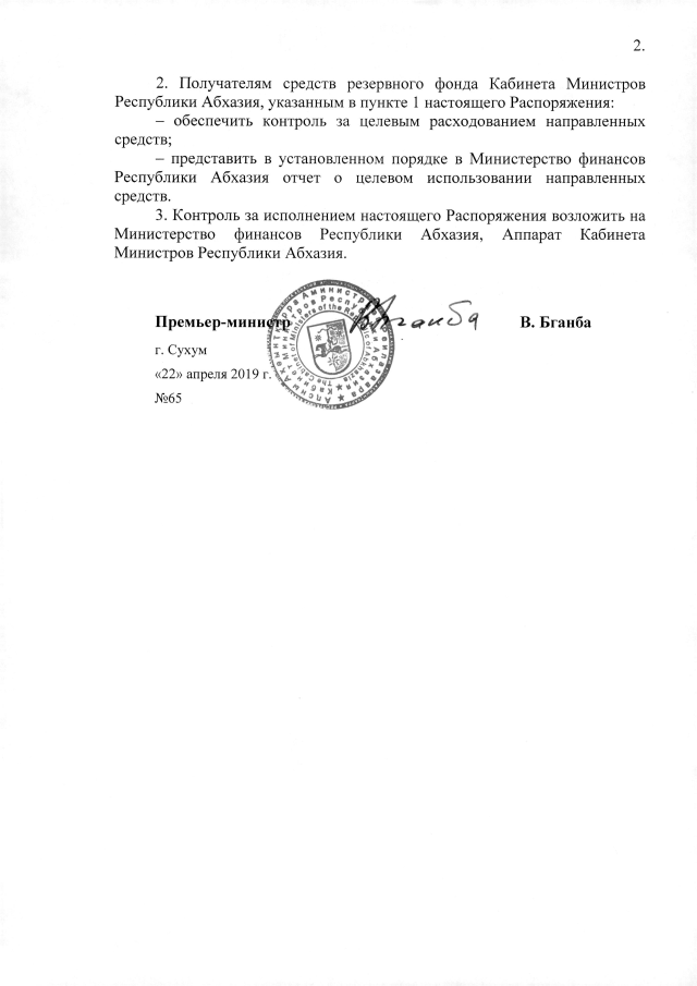 РАСПОРЯЖЕНИЕ Кабинета Министров Республики Абхазия от 22.04.2019 №65 "Об использовании средств резервного фонда Кабинета Министров Республики Абхазия"