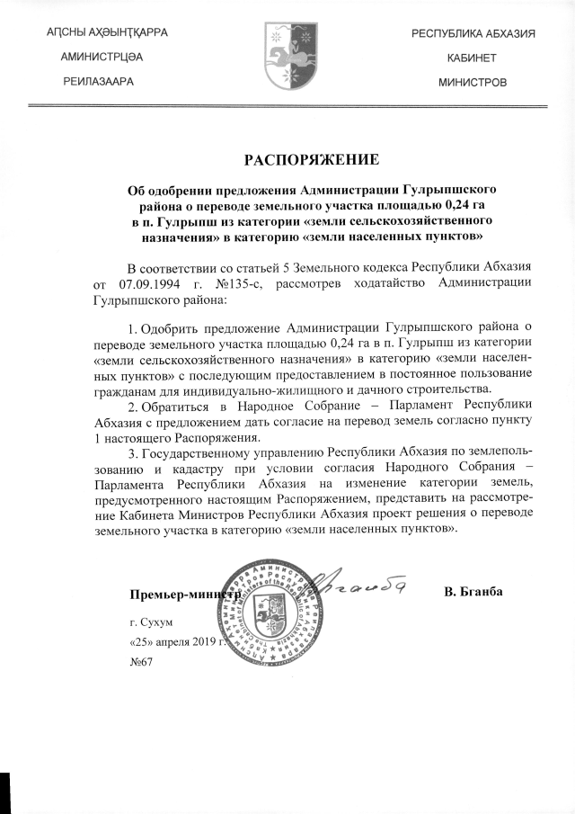 РАСПОРЯЖЕНИЕ Кабинета Министров Республики Абхазия от 25.04.2019 №67 "Об одобрении предложения Администрации Гулрыпшского района о переводе земельного участка площадью 0,24 га в п. Гулрыпш из категории "земли сельскохозяйственного назначения" в категорию "земли населенных пунктов""