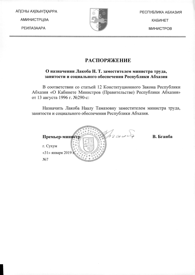 РАСПОРЯЖЕНИЕ Кабинета Министров Республики Абхазия от 31.01.2019 №7 "О назначении Лакоба Н.Т. заместителем министра труда, занятости и социального обеспечения Республики Абхазия"