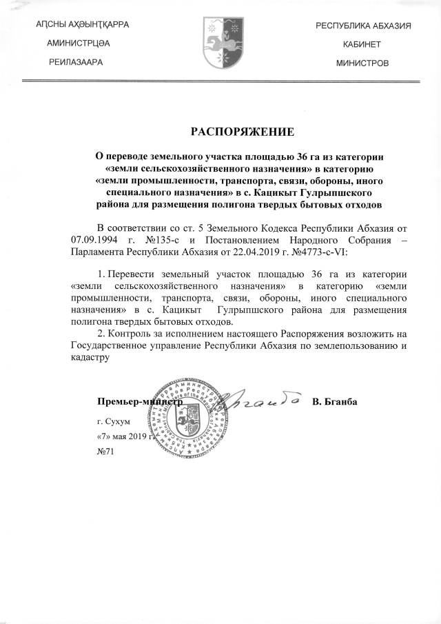 РАСПОРЯЖЕНИЕ Кабинета Министров Республики Абхазия от 07.05.2019 №71 "О переводе земельного участка площадью 36 га из категории "земли сельскохозяйственного назначения" в категорию "земли промышленности, транспорта, связи, обороны, иного специального назначения" в с. Кацикыт Гулрыпшского района для размещения полигона твердых бытовых отходов"
