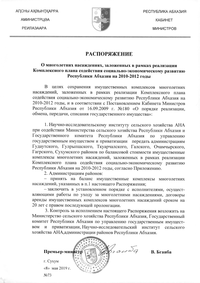 РАСПОРЯЖЕНИЕ Кабинета Министров Республики Абхазия от 08.05.2019 №73 "О многолетних насаждениях, заложенных в рамках реализации Комплексного плана содействия социально-экономическому развитию Республики Абхазия на 2010-2012 годы"