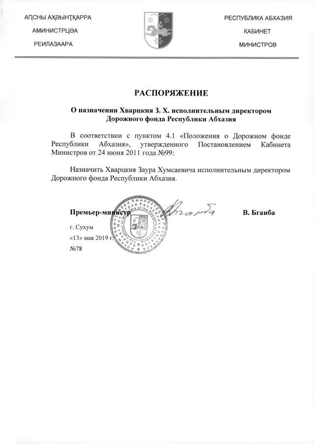 РАСПОРЯЖЕНИЕ Кабинета Министров Республики Абхазия от 13.05.2019 №78 "О назначении Хварцкия 3.X. исполнительным директором Дорожного фонда Республики Абхазия"