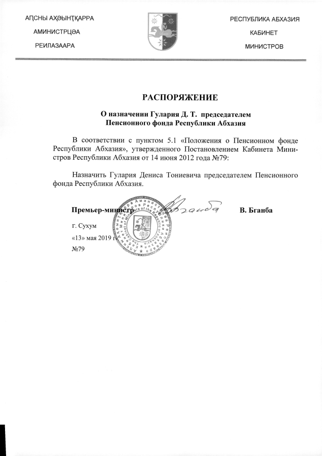 РАСПОРЯЖЕНИЕ Кабинета Министров Республики Абхазия от 13.05.2019 №79 "О назначении Гулария Д.Т. председателем Пенсионного фонда Республики Абхазия"