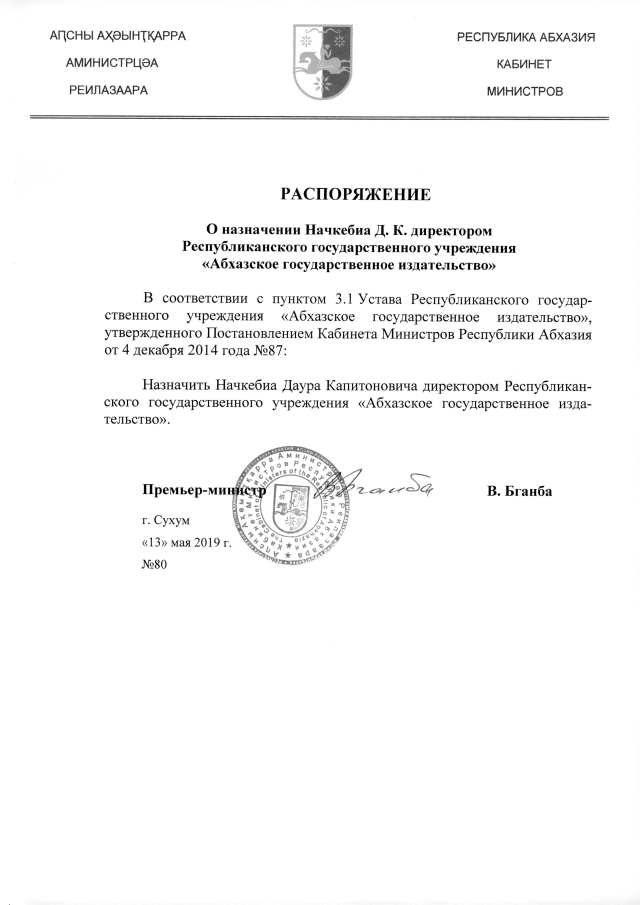 РАСПОРЯЖЕНИЕ Кабинета Министров Республики Абхазия от 13.05.2019 №80 "О назначении Начкебиа Д.К. директором Республиканского государственного учреждения "Абхазское государственное издательство""