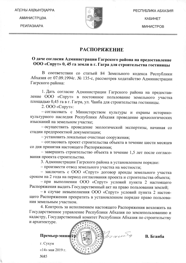 РАСПОРЯЖЕНИЕ Кабинета Министров Республики Абхазия от 14.05.2019 №85 "О даче согласия Администрации Гагрского района на предоставление ООО "Спрут" 0,45 га земли в г. Гагра для строительства гостиницы"