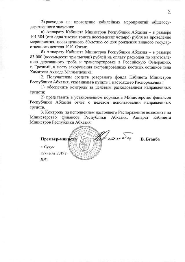 РАСПОРЯЖЕНИЕ Кабинета Министров Республики Абхазия от 27.05.2019 №91 "Об использовании средств резервного фонда Кабинета Министров Республики Абхазия"