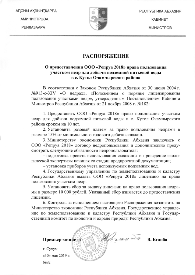 РАСПОРЯЖЕНИЕ Кабинета Министров Республики Абхазия от 30.05.2019 №92 "О предоставлении ООО "Репруа 2018" права пользования участком недр для добычи подземной питьевой воды в с. Кутол Очамчырского района"