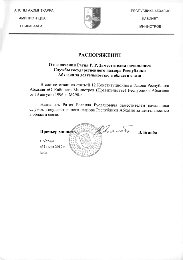 РАСПОРЯЖЕНИЕ Кабинета Министров Республики Абхазия от 31.05.2019 №98 "О назначении Ратия Р.Р. Заместителем начальника Службы государственного надзора Республики Абхазия за деятельностью в области связи"