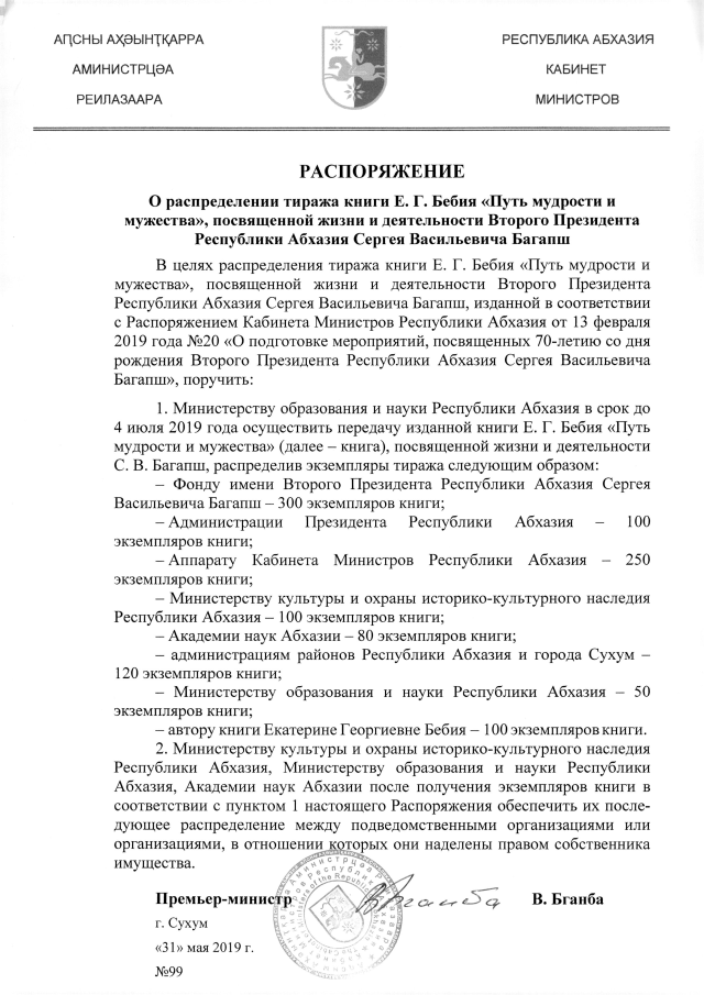 РАСПОРЯЖЕНИЕ Кабинета Министров Республики Абхазия от 31.05.2019 №99 "О распределении тиража книги Е.Г. Бебия "Путь мудрости и мужества", посвященной жизни и деятельности Второго Президента Республики Абхазия Сергея Васильевича Багапш"