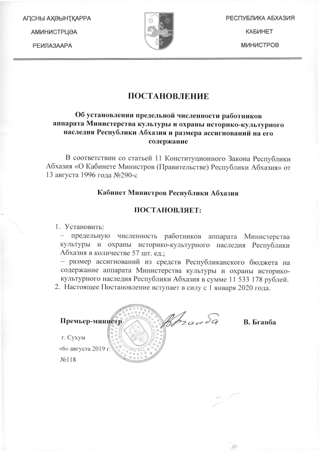 Постановление Кабинета Министров Республики Абхазия от 6.08.2019 №118 "Об установлении предельной численности работников аппарата Министерства культуры и охраны историко-культурного наследия Республики Абхазия и размера ассигнований на его содержание "