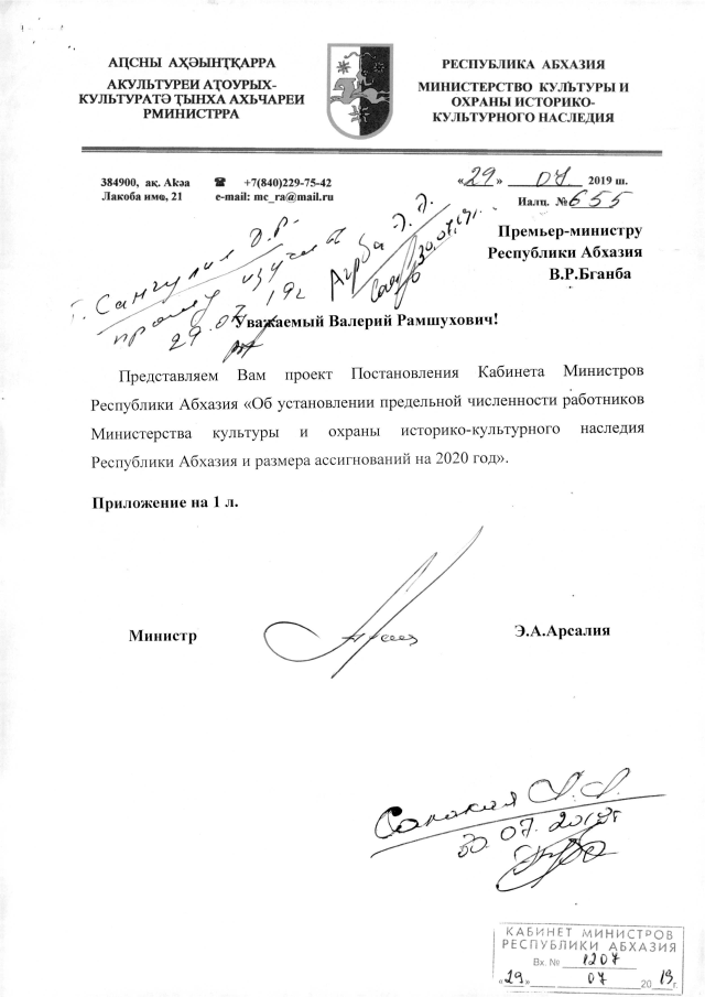 Постановление Кабинета Министров Республики Абхазия от 6.08.2019 №118 "Об установлении предельной численности работников аппарата Министерства культуры и охраны историко-культурного наследия Республики Абхазия и размера ассигнований на его содержание "
