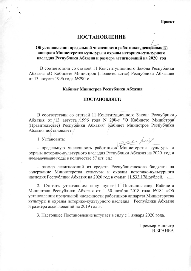 Постановление Кабинета Министров Республики Абхазия от 6.08.2019 №118 "Об установлении предельной численности работников аппарата Министерства культуры и охраны историко-культурного наследия Республики Абхазия и размера ассигнований на его содержание "